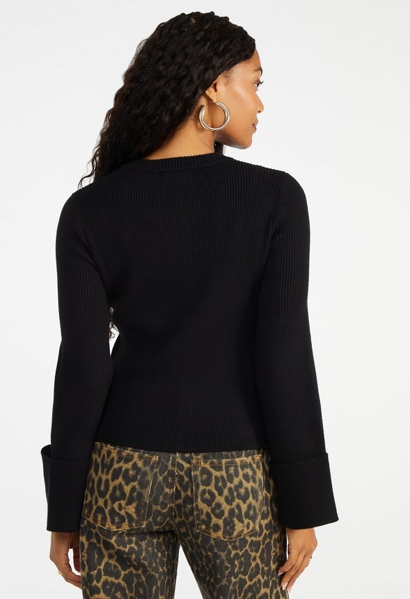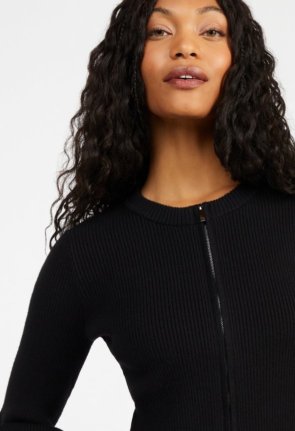 Zipper front Cuffed Bell sleeves Material : 36% Viscose, 33% Polyester, 21% Acrylic, 10% Nylon Length : 20.5 Care : Machine wash. Please refer to care instruction label inside garment for further details. Imported